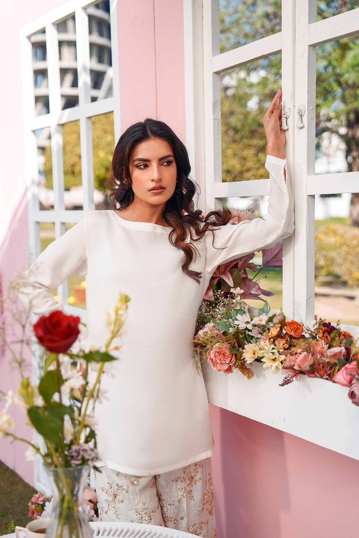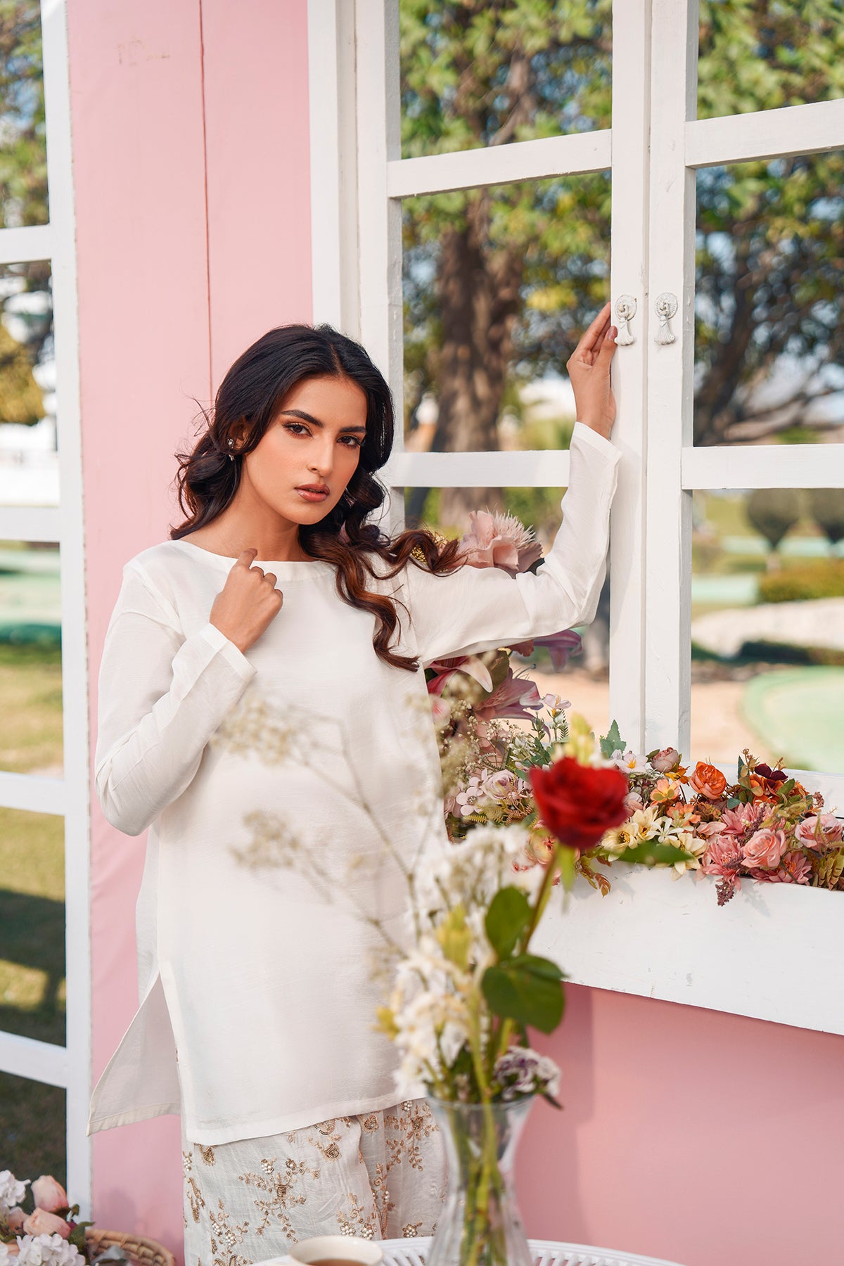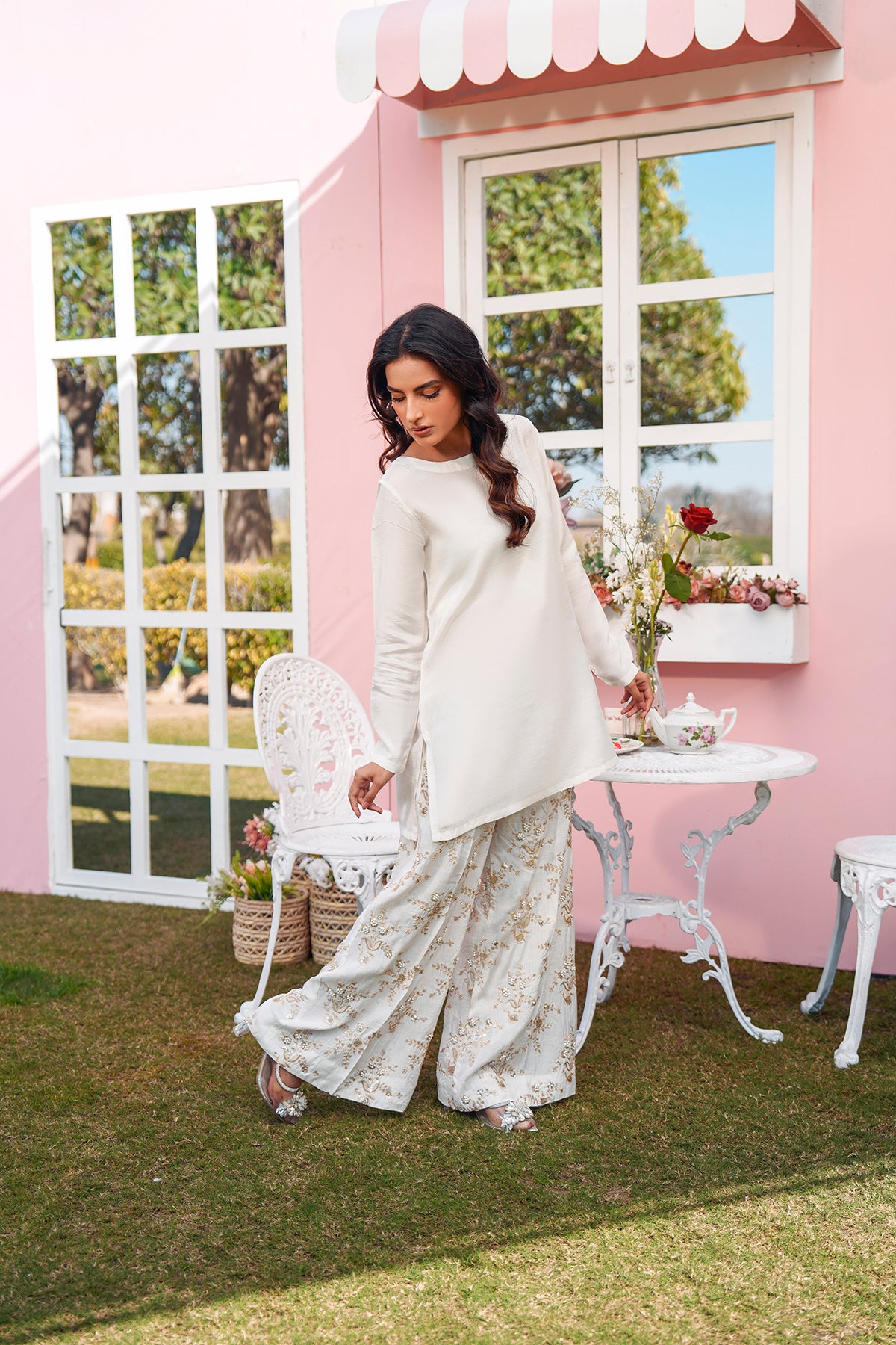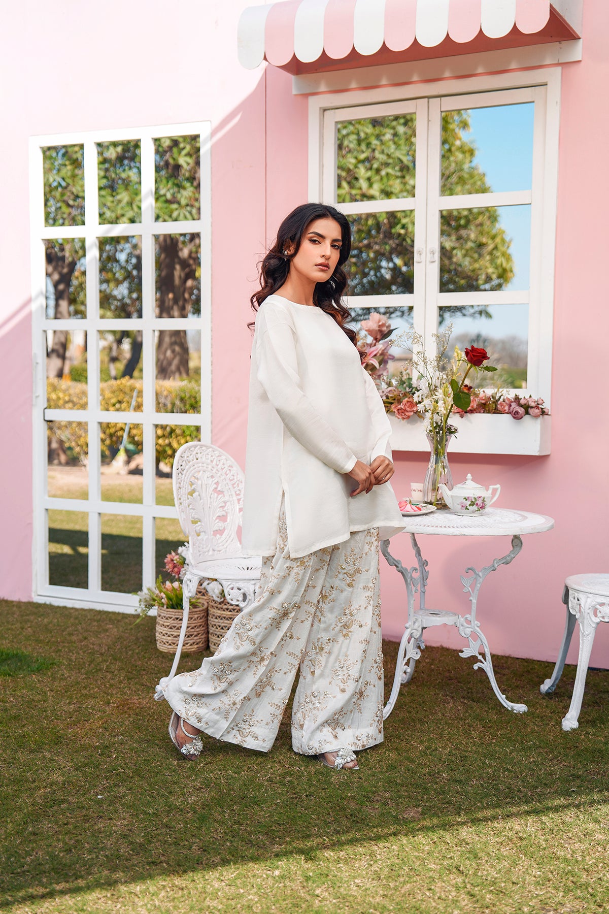 Elevate your style with this luxurious women’s ensemble featuring a silk top adorned with intricate golden embroidery, paired with matching trousers accented with delicate hand-punched beads. The rich silk fabric offers a soft, flowing drape for a graceful silhouette, while the golden embroidery adds a touch of regal sophistication. Handcrafted beadwork on the trousers creates subtle shimmer and texture, making this set perfect for festive occasions, evening events, or special gatherings. Experience the perfect blend of elegance, craftsmanship, and contemporary design in one stunning outfit.