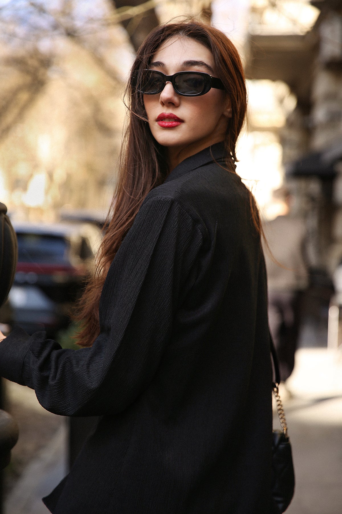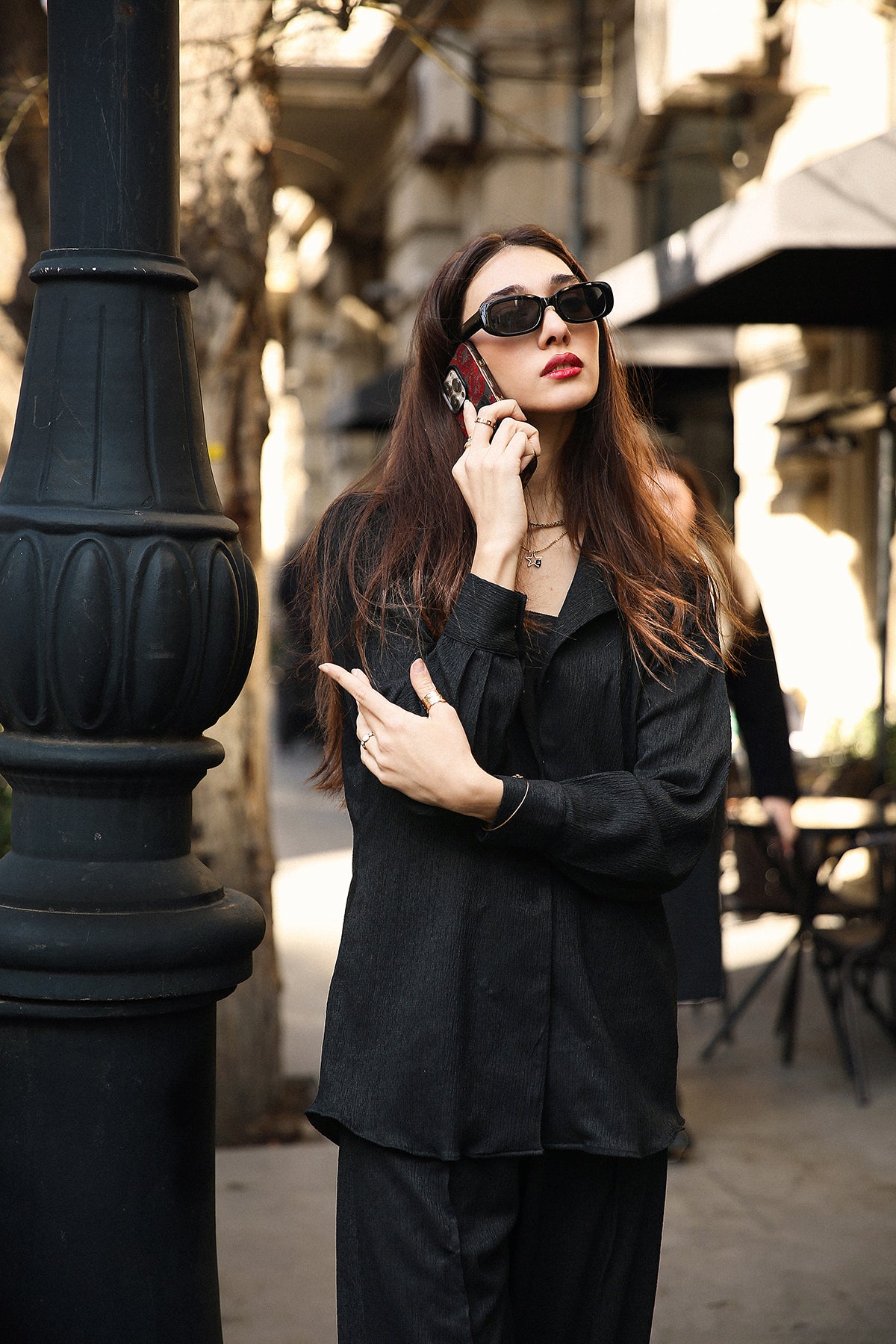 The oversized button-down blazer-shirt features a sharp collar and relaxed cuffs, while the matching wide-leg trousers offer a flattering, high-waisted fit. Whether paired with statement sunglasses for a "paparazzi-ready" look or dressed up with stilettos, the Onyx Set is the ultimate power move for the modern woman.