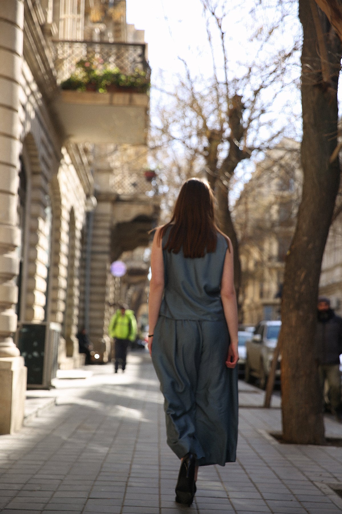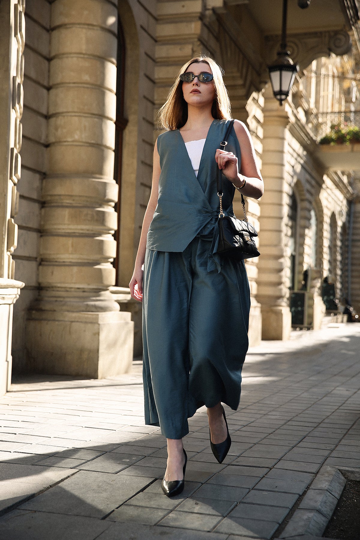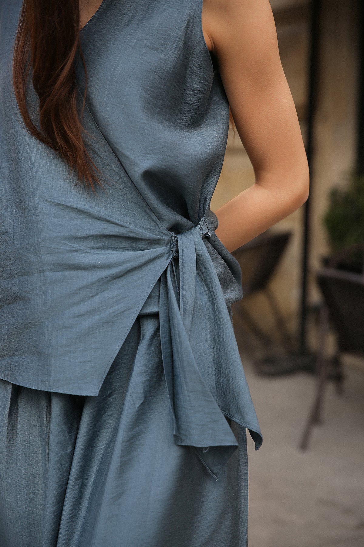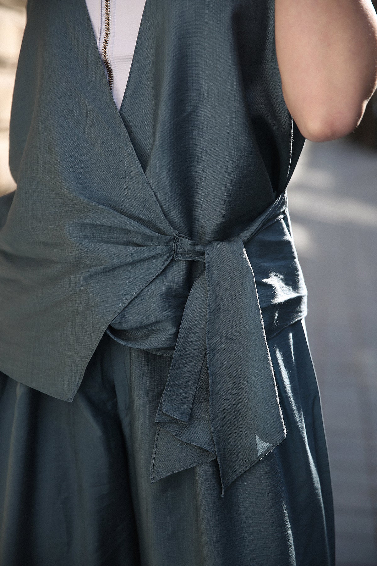 A masterclass in geometric tailoring, this set features a sleeveless V-neck tunic with a dramatic, diagonal wrap-effect hemline that adds dynamic movement to a structured look. Full-length, wide-leg trousers provide a stable, flowing foundation that elongates the frame.