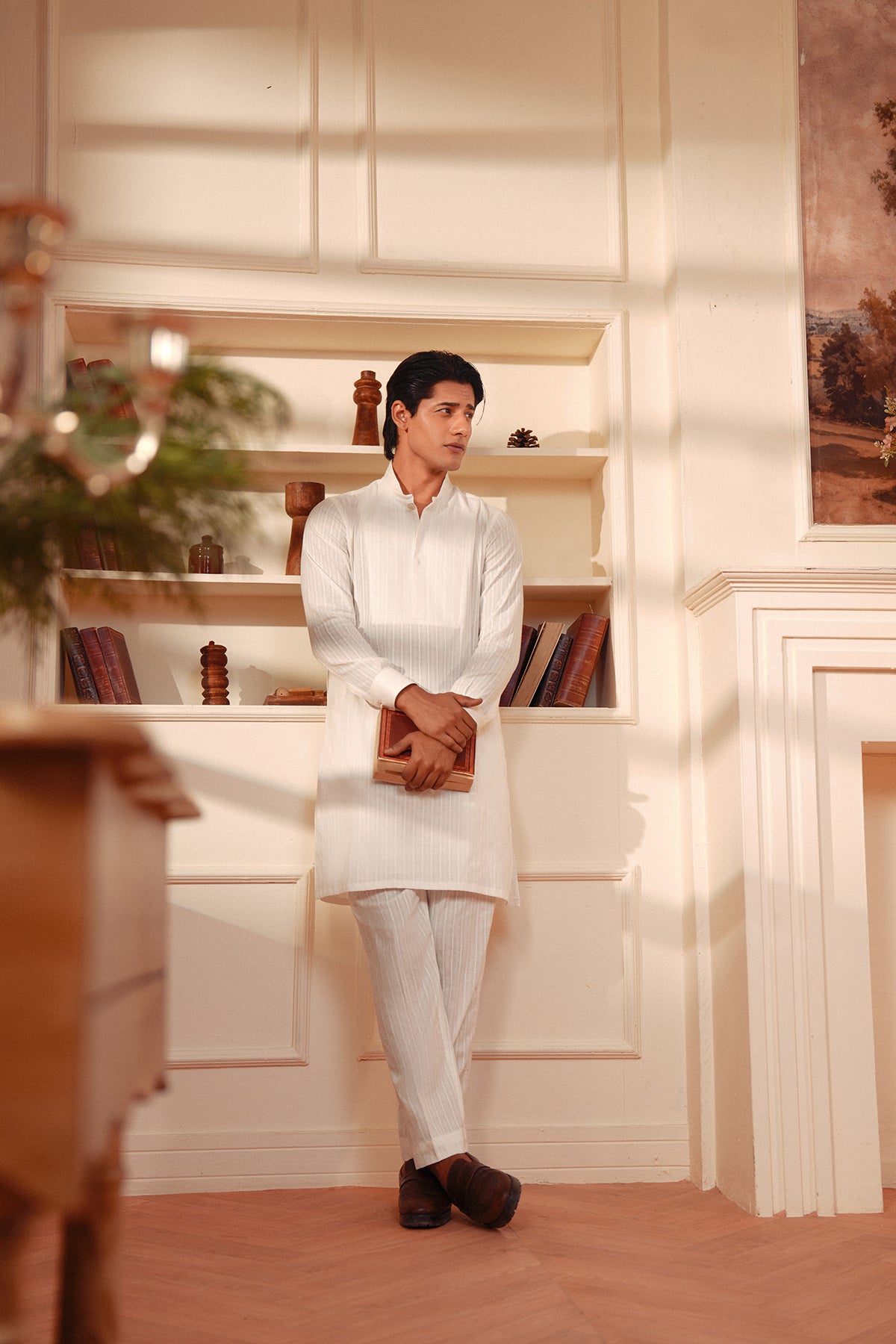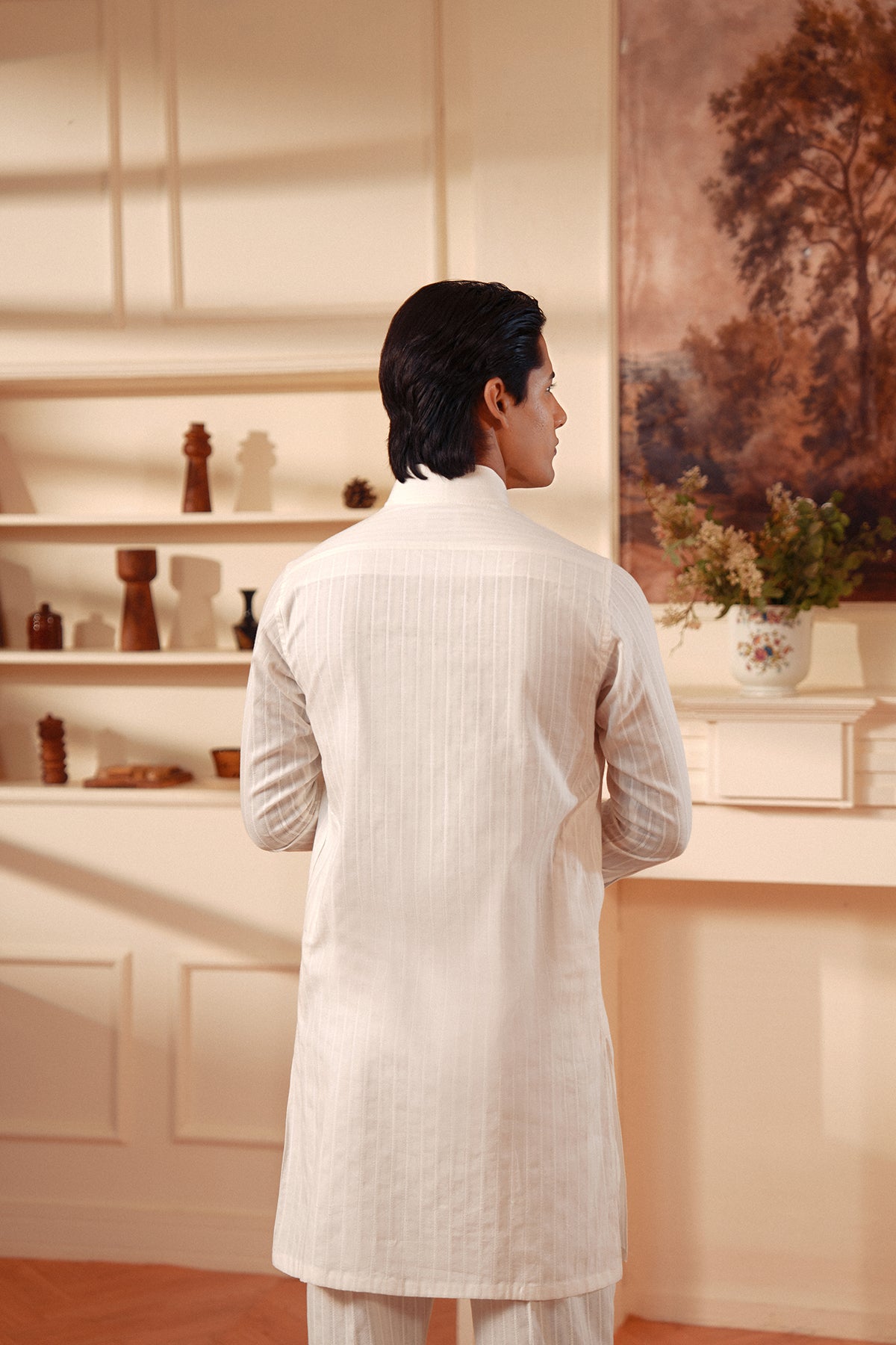 A study in understated elegance — this white kurta set is crafted from lightweight textured cotton, offering refined comfort with a modern silhouette. The subtle stripe weave adds depth to the monochrome design, while the band collar and concealed placket keep the look clean and contemporary. Paired with matching trousers, it’s a versatile ensemble for both festive gatherings and everyday sophistication