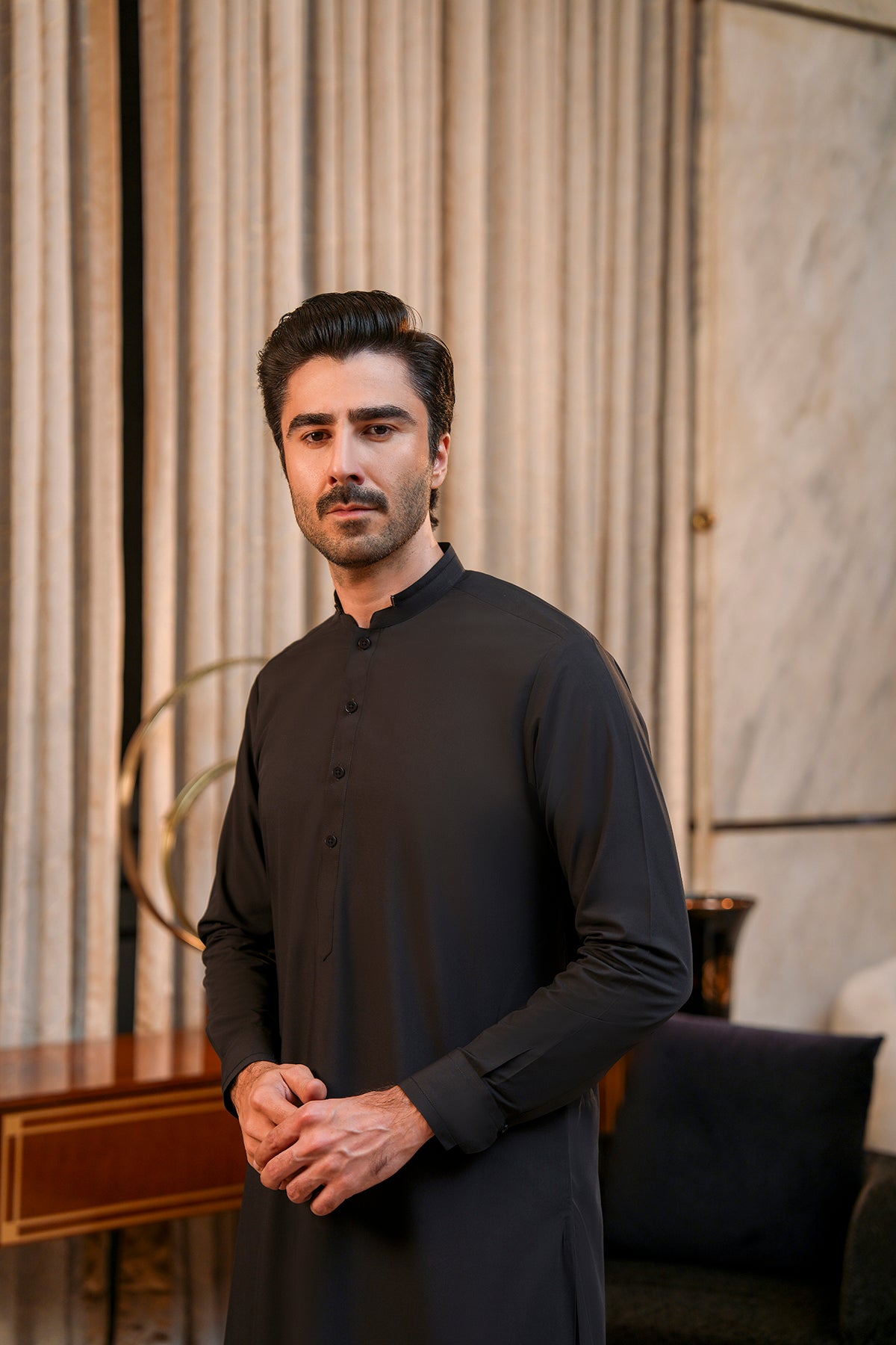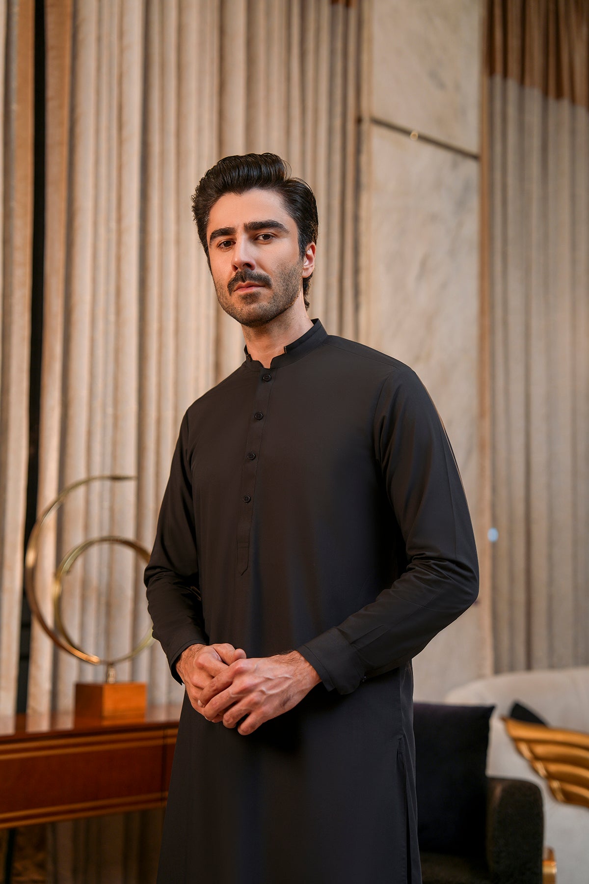Make a statement in this stylish double-band kurta shalwar, crafted from premium wash-and-wear fabric for comfort and ease. The standout feature is the collar adorned with sleek metal trim, adding a modern, sophisticated edge to a classic silhouette. Paired with a tailored shalwar, this ensemble offers a perfect blend of tradition and contemporary style. Ideal for festive occasions, family gatherings, or semi-formal events, it ensures you look polished while staying comfortable all day.