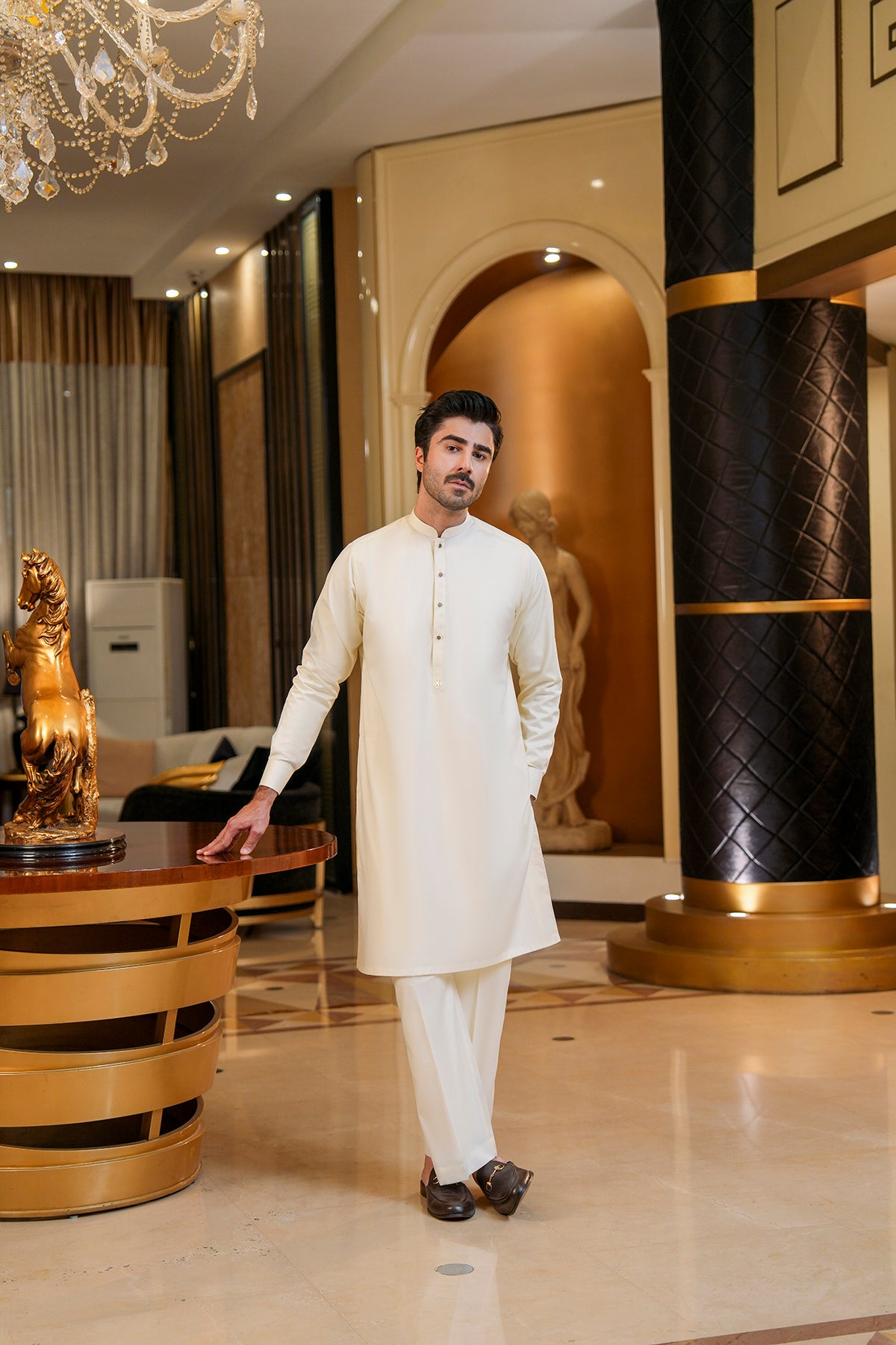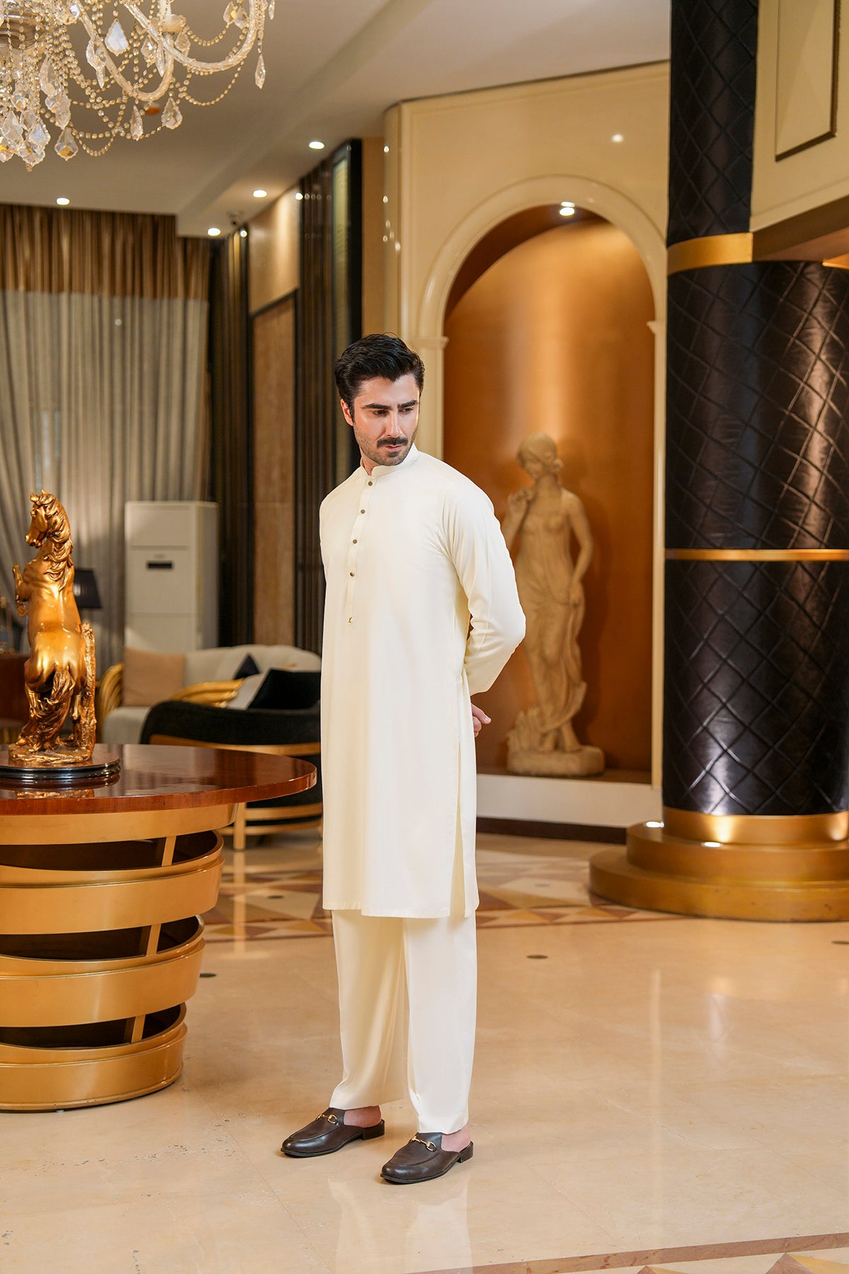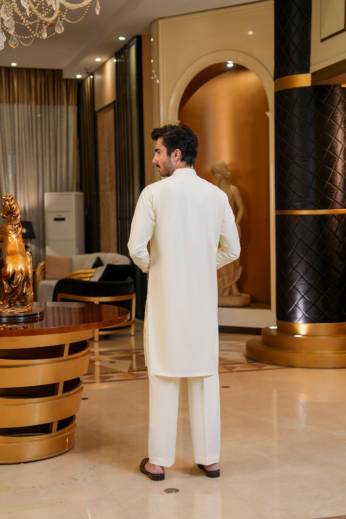 Wash & Wear Shalwar Kameez Stay stylish with effortless comfort in this wash-and-wear shalwar kameez. The kurta is designed with a clean, contemporary silhouette, featuring a metal button and a decorative metal pin at the end of the placket for a subtle touch of sophistication....