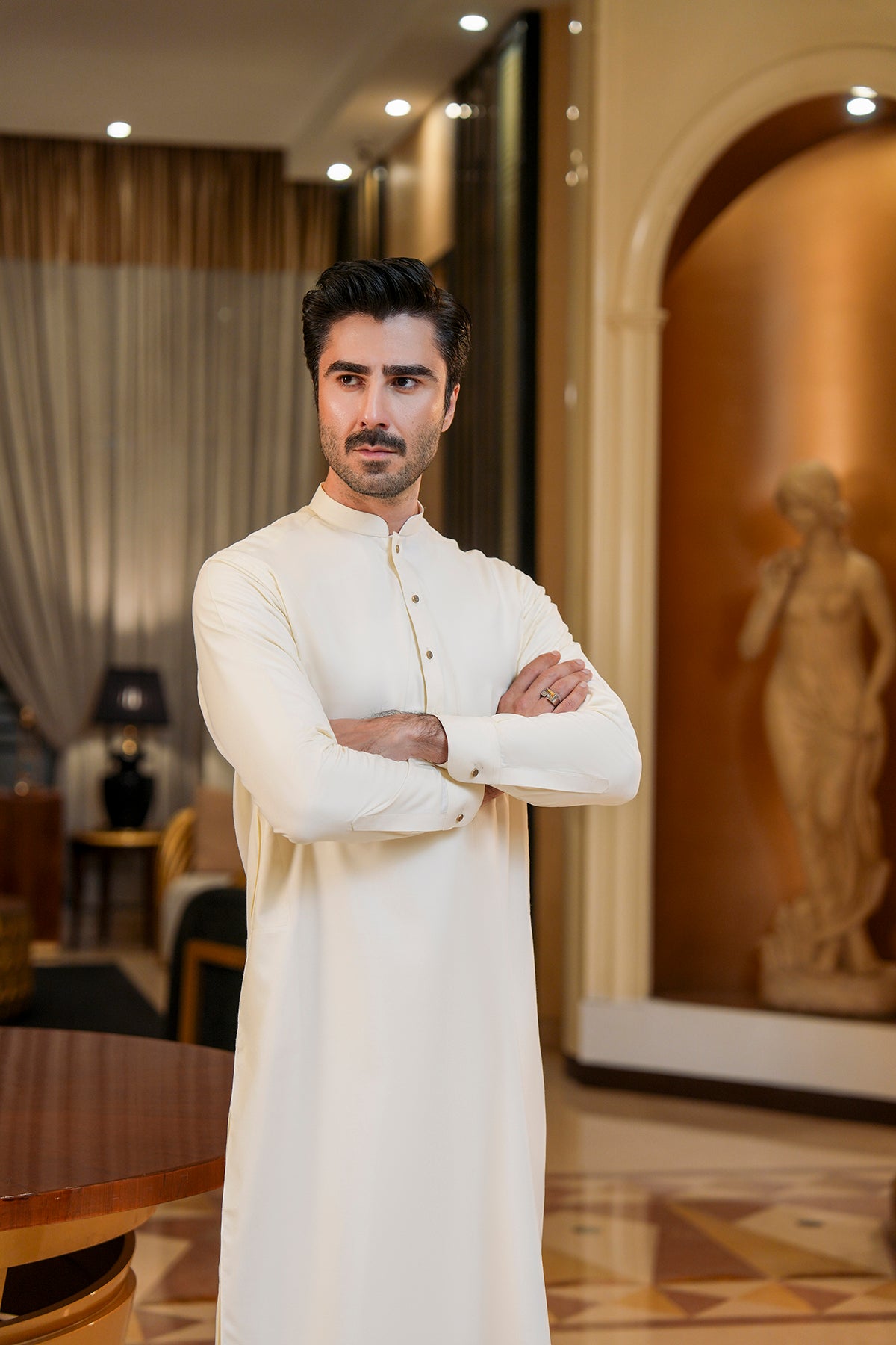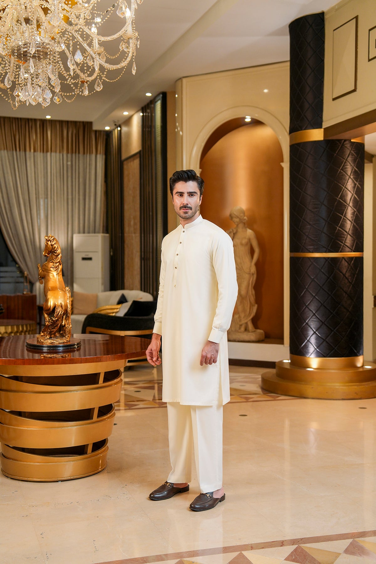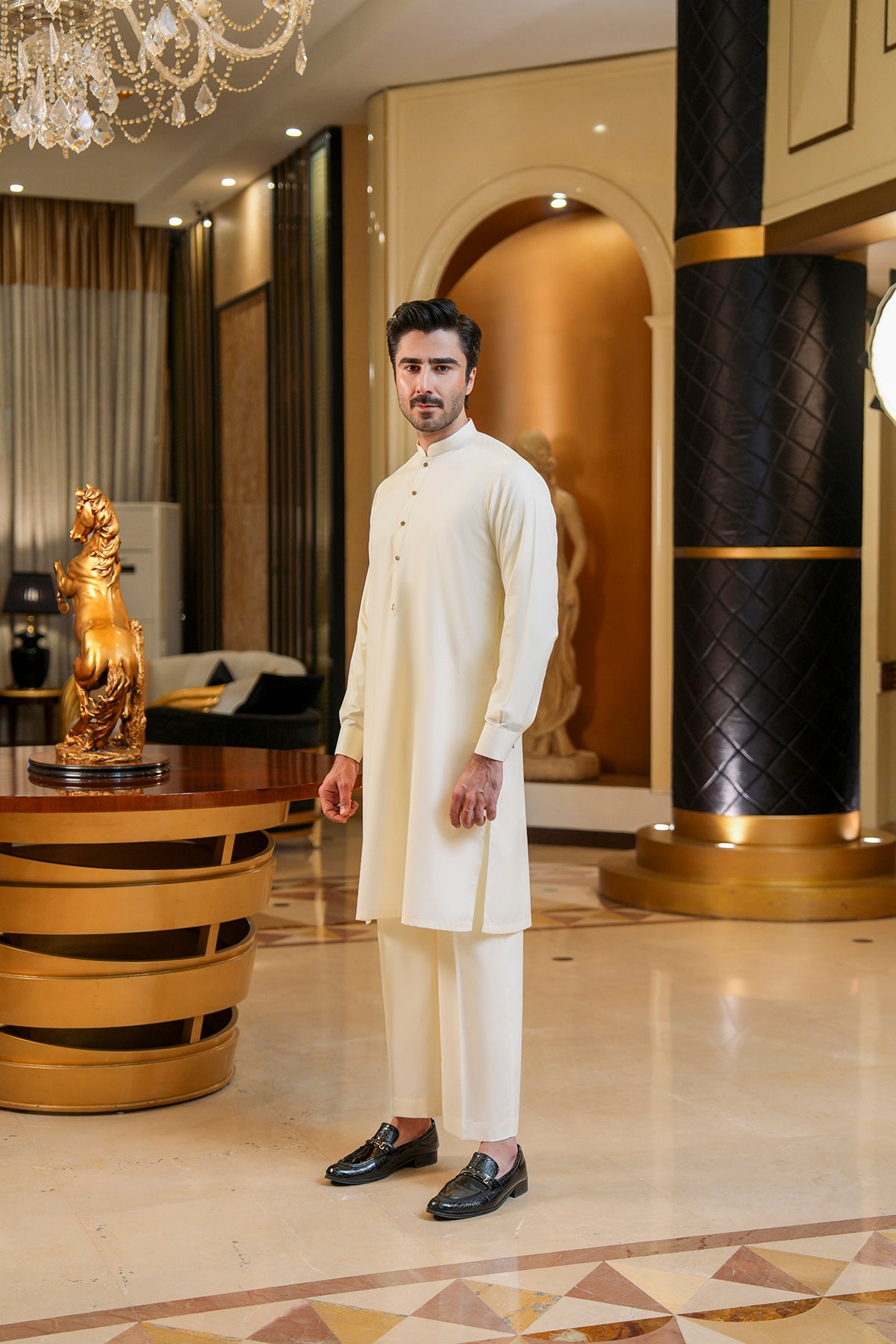 Wash & Wear Shalwar Kameez Stay stylish with effortless comfort in this wash-and-wear shalwar kameez. The kurta is designed with a clean, contemporary silhouette, featuring a metal button and a decorative metal pin at the end of the placket for a subtle touch of sophistication....