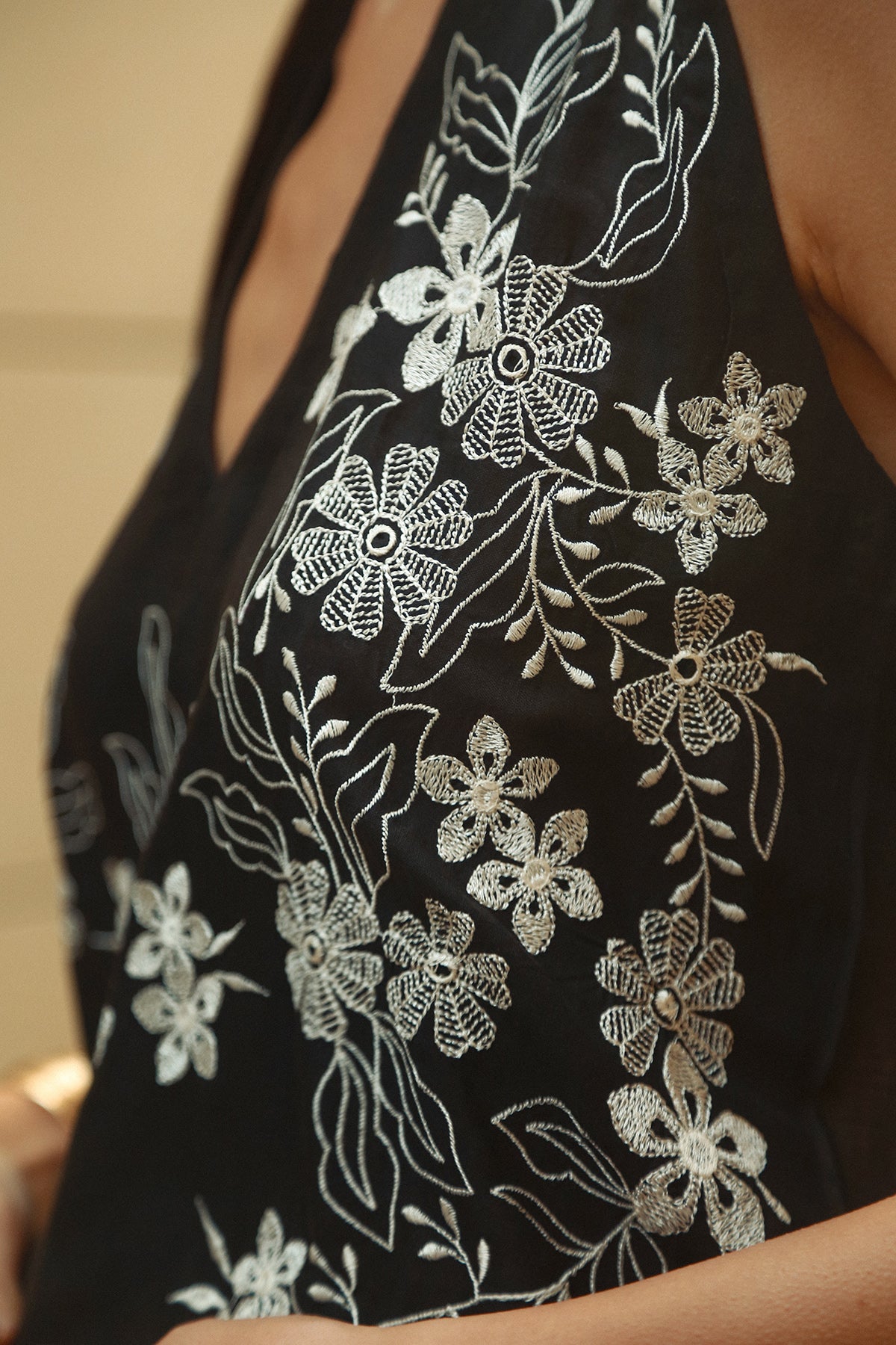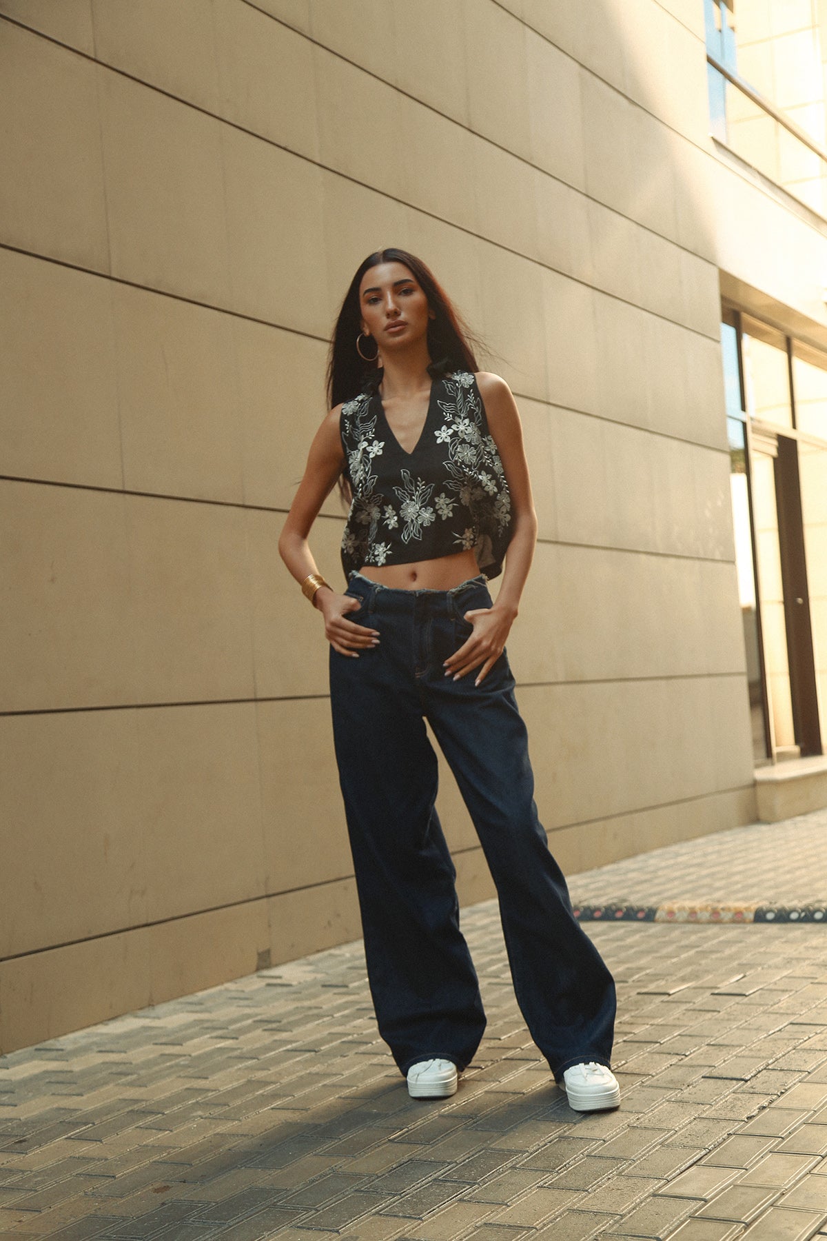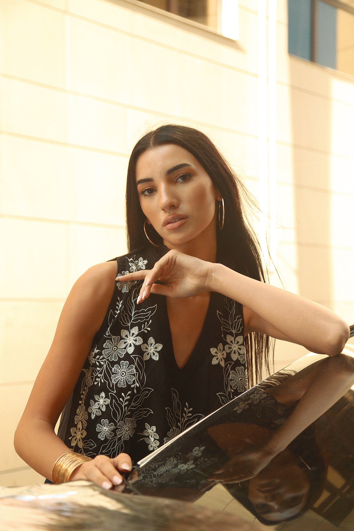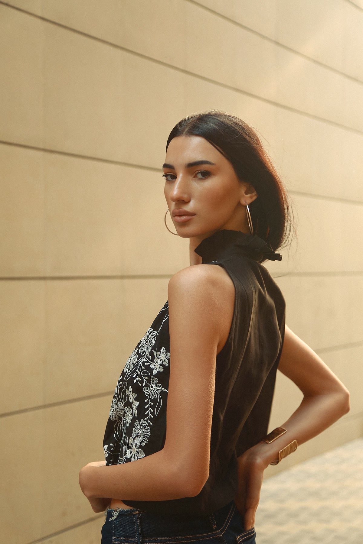 A versatile black top detailed with delicate white embroidery for a classic contrast look. Designed in a comfortable fit with timeless styling, it’s easy to pair with jeans, trousers, or skirts for both casual and semi-formal wear.
